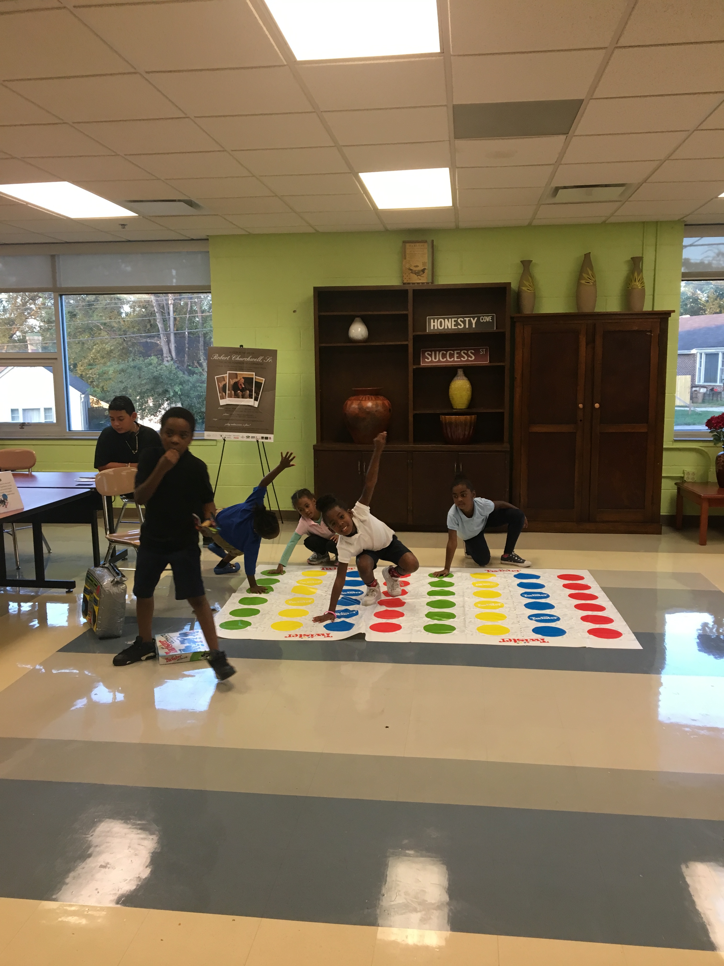 Students playing Twister, a popular game in the 1980s